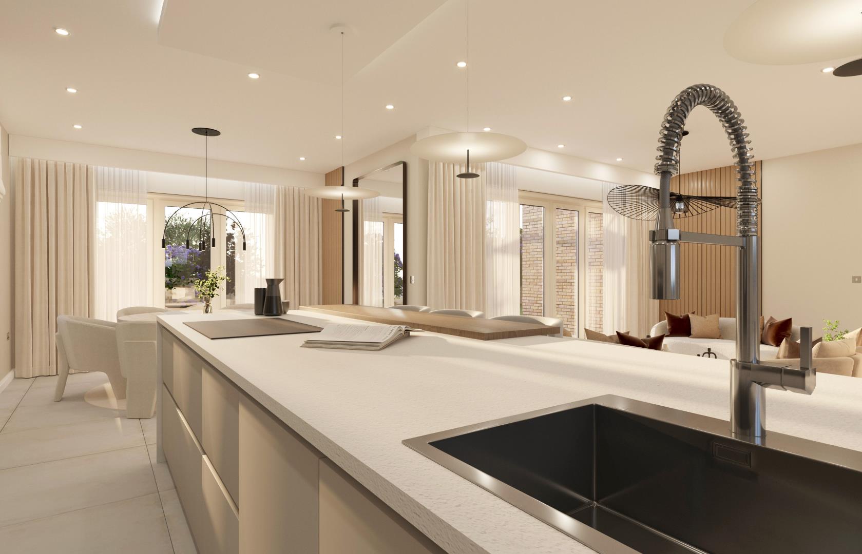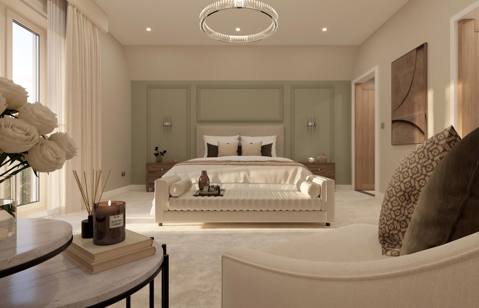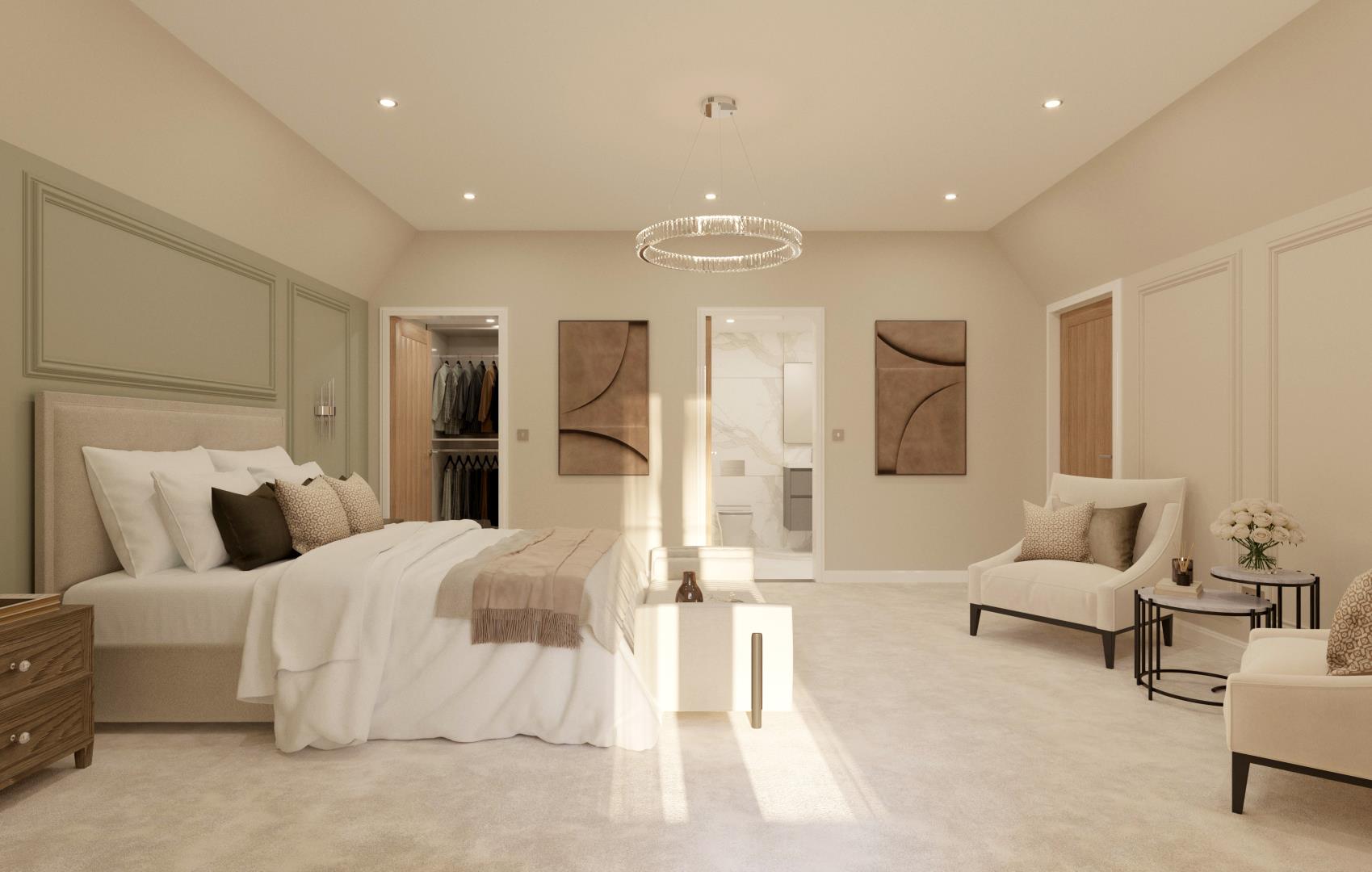 Cleverly designed by leading architects, the open-plan layout utilises shape to create a distinctive space for form and function. An L-shape kitchen, dining and living area coexist in a way for perfect harmony, leading to the patio area via bi-fold doors. A pantry is close by for extra storage and a boot room and utility leads to the garden, perfect for muddy walks along the stretch of Colne Water. Also looking out towards Ferndean View, the drawing room, complete with a gas burning stove, provides another area for relaxation. The downstairs bathroom is across the lobby, close to the study which overlooks the front of the house.