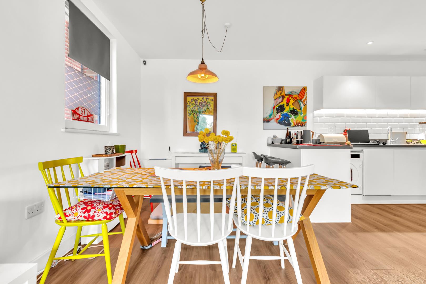 To the right of the turning in the hallway is access to the kitchen and further to left is the second bedroom. This bedroom has a large floor to ceiling window looking onto the park and Victorian style geometric flooring.