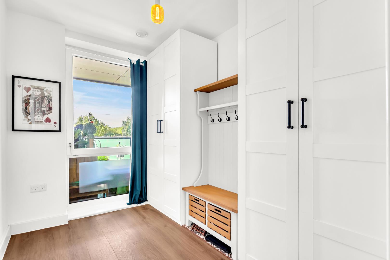 To the right there’s a large storage cupboard, handy for household items, housing the consumer unit and water tank.
