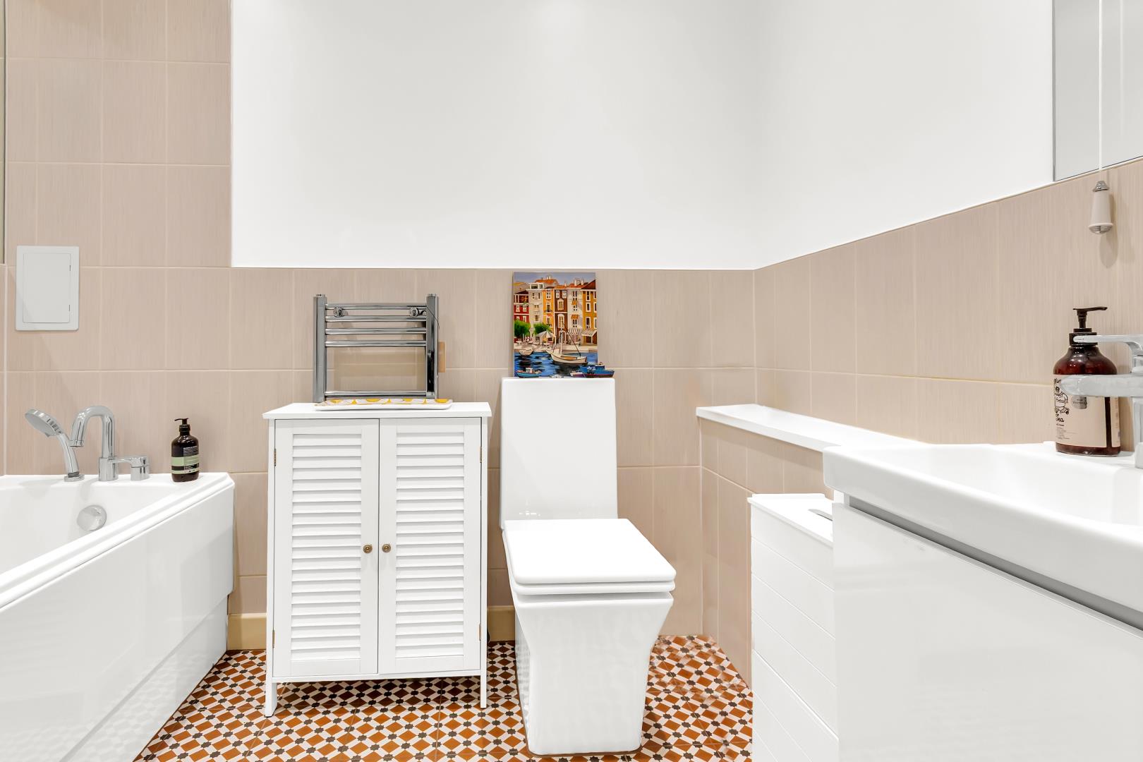 To the left is the main bathroom. The main bathroom has a wall hanging vanity unit with mirror above, splashback tiles, towel radiator and a bath tub with pull out shower with large mirror above and Victorian style tiles to the floor.