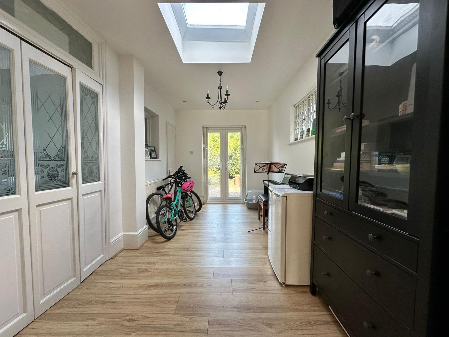 The dining place has the continuation of flooring with storage cupboard to the right and ahead to the rear of dining room is access to the garden.